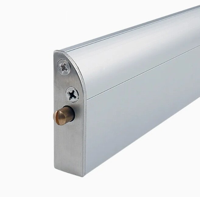 Vedação com acionamento automático na parte inferior da porta, através de pino que pressiona contra o batente.