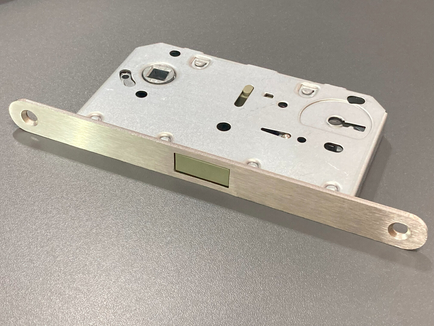 - Fechaduras magnéticas disponíveis nas versões com chave interna, WC e cilindro euro perfil, acabamento inox escovado.